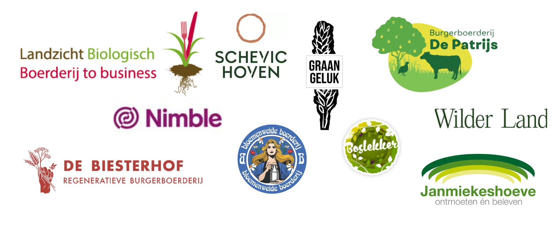 Een greep uit de partijen die je kunt ontmoeten: Landzicht, De Biesterhof, Bloemenweideboerderij, De Patrijs, Nimble, Janmiekeshoeve, Boslekker, Schevichoven, Graangeluk, Wilderland – en andere boeren en schakels uit de natuurlijke keten. Dit omvat allerlei soorten landbouw, van regeneratief tot biologisch en van agroforestry tot voedselbosbouw.