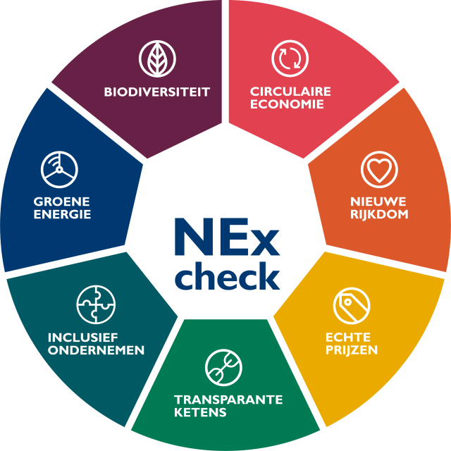 De Nieuwe Economie Index (NEx) is een macro-economisch onderzoek naar hoe duurzaam de Nederlandse economie is. Het onderzoek geeft daarmee inzicht naar ‘de stand van het land’. Het zegt in principe niets over hoe duurzaam individuele bedrijven zijn. De NEx-check meet op basis van dezelfde zeven thema’s. De vragen die je beantwoordt hebben overlap met hoe de NEx wordt bepaald maar zijn niet een-op-een vergelijkbaar.