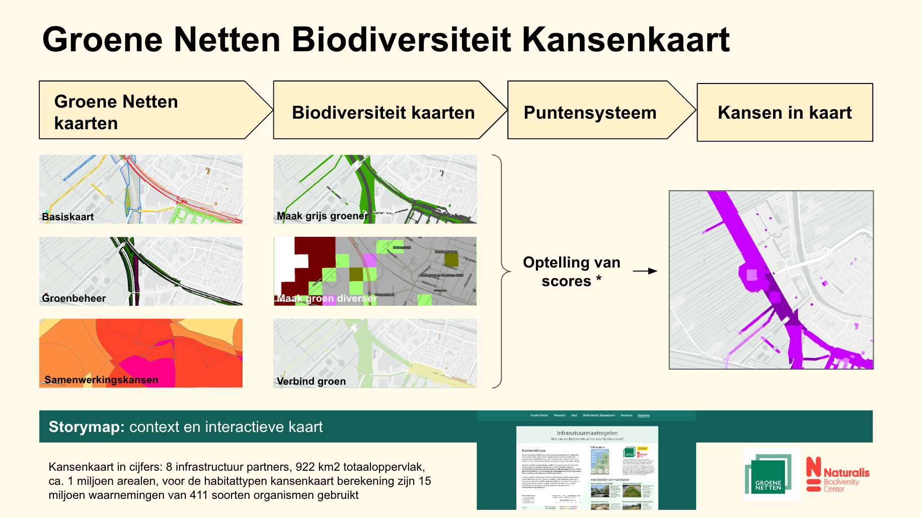 Met de Biodiversiteit Kansenkaart wordt antwoord gegeven op de vraag: 'Wat zijn de kansen in het Groene Netten areaal om biodiversiteit te versterken?'. De kaart, uitgevoerd als GIS (Geografisch InformatieSysteem), geeft bijvoorbeeld aanklikbaar weer waar meerdere partijen zitten en waar natuurgebieden zitten. Zodat als er onderhoud gepleegd moet worden er samengewerkt kan worden voor biodiversiteit.